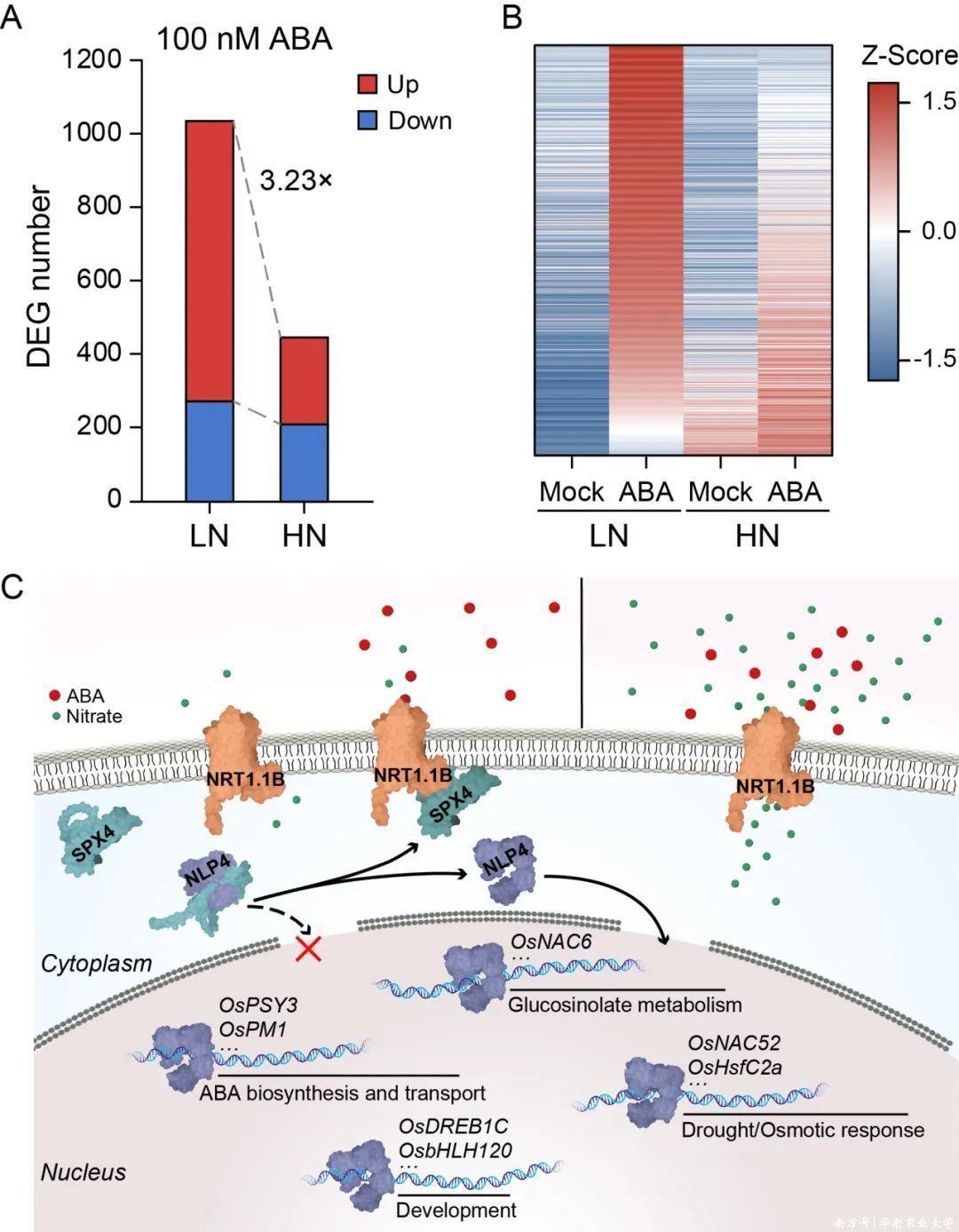 自然界中,矿质养分的有效含量通常较低,而当前植物逆境生物学及ABA信号研究却多在营养过剩的培养条件下开展。该研究发现,在低硝酸盐(LN)环境下,水稻对ABA的响应十分剧烈;而在高硝酸盐(HN)环境下,这种响应则受到显著抑制,ABA激活基因数不足LN条件下的30%(图1A),且受诱导基因的上调程度也显著低于LN条件(图1B)。因此,LN条件下可触发更为活跃的ABA响应,这也暗示植物体内存在能够整合氮营养状态和ABA信号的分子调控机制,植物能根据氮营养的多少,调整对逆境的“敏感度”。